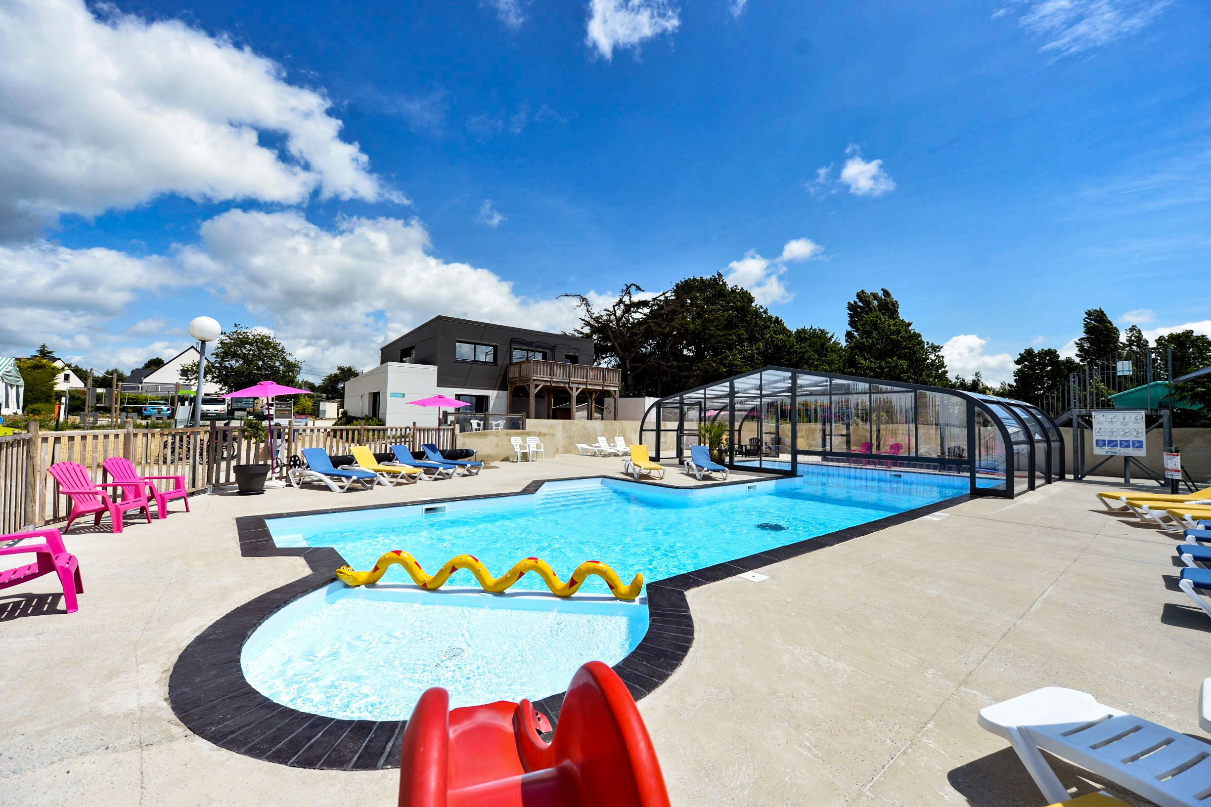Au Camping étoilé de Rhuys à Theix, nous vous proposons un parc aquatique qui fera le bonheur de toute la famille. Notre camping dans le Morbihan a une piscine couverte et chauffée ouverte tous les jours, de 10h30 à 19h en basse saison et jusqu’à 20h en haute saison, pour vous permettre de profiter de l’eau en toute saison.