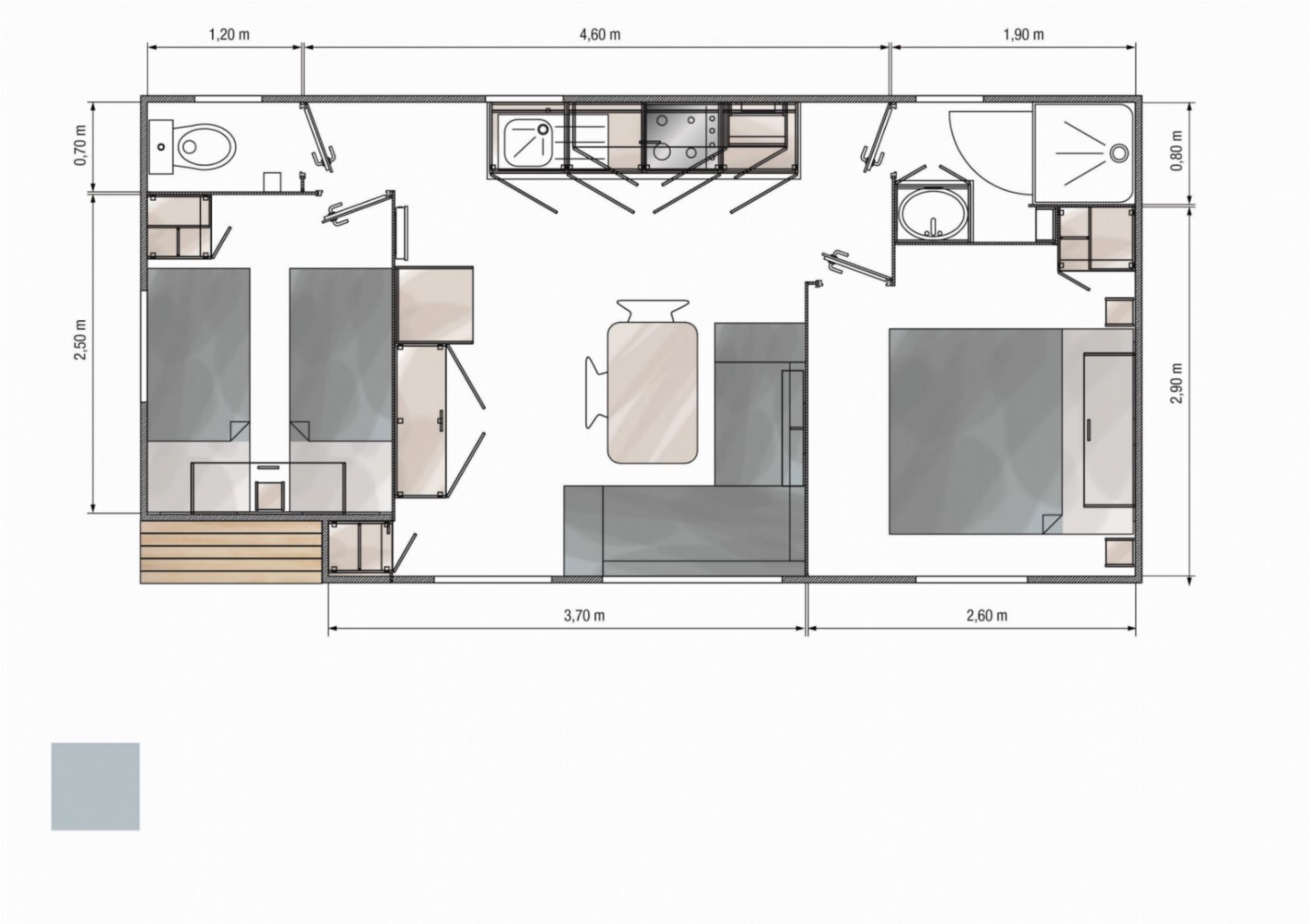 Mobil-home de 28 m² pouvant accueillir jusqu’à 4 personnes. Il se compose de deux chambres : une avec un lit double de 140 x 190 cm et une avec deux lits simples séparés de 80 x 190 cm. Oreillers et couettes sont fournis. Le séjour comprend un coin repas avec cuisine équipée (réfrigérateur, micro-ondes, plaques de cuisson au gaz, cafetière expresso Dolce Gusto, vaisselle pour 6 personnes) ainsi qu’une télévision. La salle d’eau dispose d’une douche et les WC sont séparés. À l’extérieur, une terrasse avec table, chaises et deux chaises longues complète l’ensemble.