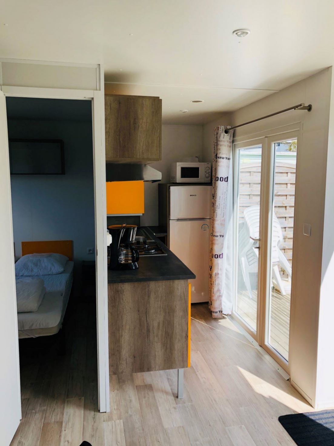 Mobil-home de 31 m² pouvant accueillir jusqu’à 6 personnes. Il se compose de trois chambres : une avec un lit double de 140 x 190 cm et deux chambres avec chacune deux lits simples séparés de 80 x 190 cm. Oreillers et couettes sont fournis. Le séjour comprend un coin repas avec cuisine équipée (réfrigérateur, micro-ondes, plaques de cuisson au gaz, cafetière expresso Dolce Gusto, vaisselle pour 6 personnes) ainsi qu’une télévision. La salle d’eau dispose d’une douche et les WC sont séparés. À l’extérieur, une terrasse avec table, chaises et deux chaises longues complète l’ensemble.