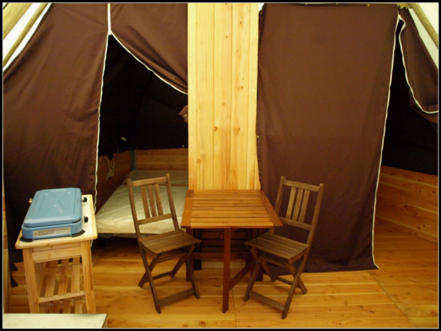 Mobil-home de 18 m² pouvant accueillir jusqu’à 4 personnes. Il se compose de deux chambres : une avec un lit double de 140 x 190 cm et une avec des lits superposés de 80 x 190 cm. Oreillers et couettes sont fournis. Le séjour comprend un coin repas avec cuisine équipée (réfrigérateur, micro-ondes, plaques de cuisson au gaz, vaisselle pour 4 personnes). La salle d’eau dispose d’une douche et les WC sont séparés. À l’extérieur, une terrasse semi-couverte avec table, chaises et deux chaises longues complète l’ensemble.